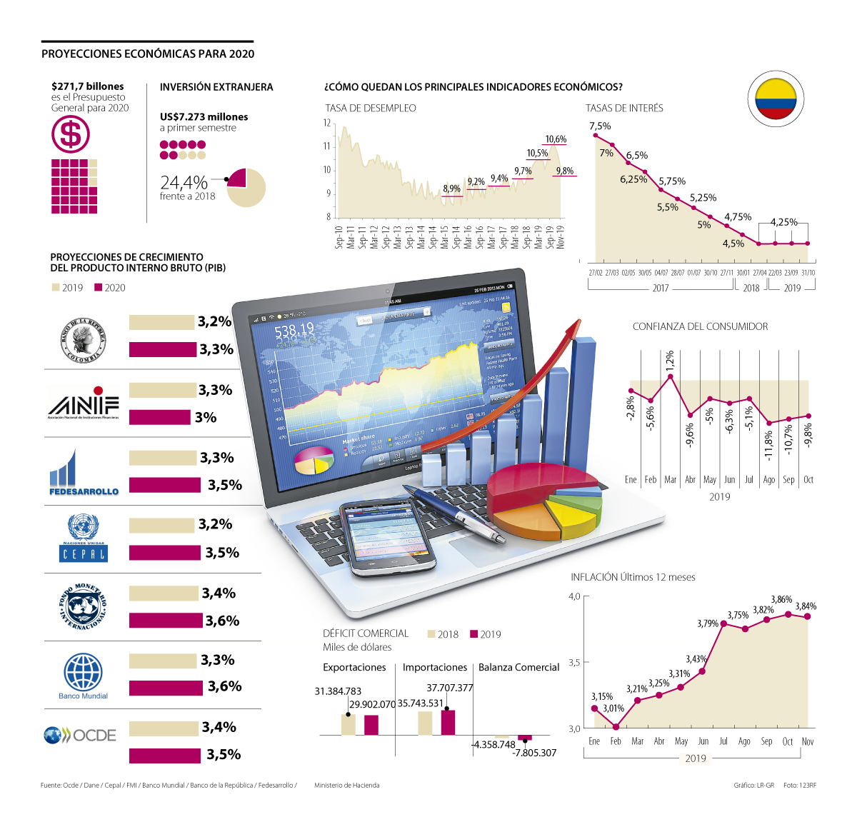 Con tasas de interés que ya superan los 18 meses en 4,25%, una inflación por debajo de 4% (3,88% exactamente según el Banco de la República) y una inversión extranjera en alza, el Gobierno, la academia, los empresarios y los expertos son optimistas frente a lo que viene en 2020. La mejor dinámica del gasto de los hogares, la importación de bienes de capital y la reactivación de industrias clave como la del petróleo y la infraestructura confirmarían dichas expectativas, que, a modo general, apuntan a que en 2020 se logré una variación en el Producto Interno Bruto de 3,3%.