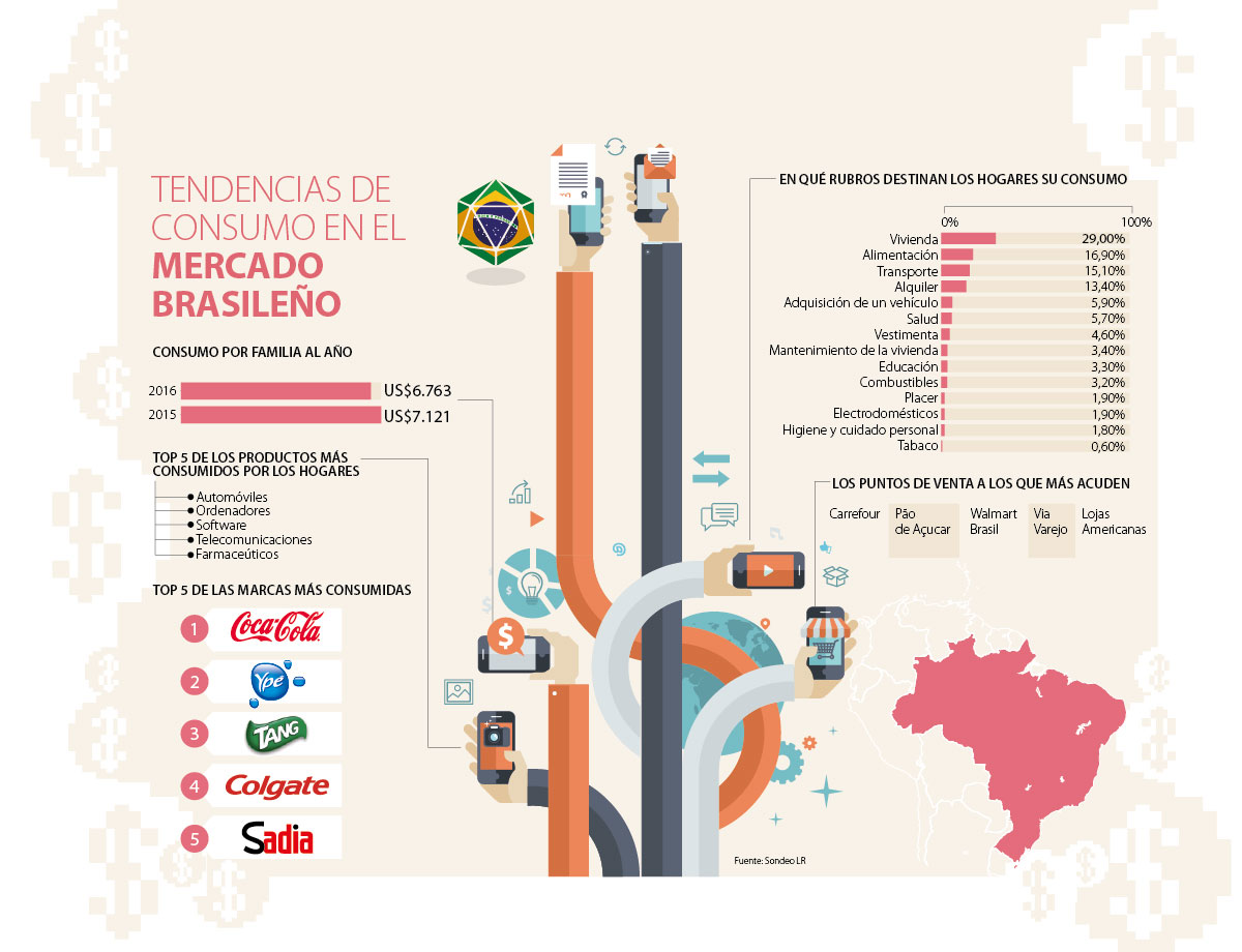De acuerdo con un informe del Banco Santander de Brasil, el consumo del país fue de US$1,4 billones, una cifra levemente menor a la registrada el año anterior, cuando se ubicó en US$1,46 billones. Si se mira un poco más atrás, el consumo de los hogares brasileños en 2014 fue de US$1,52 billones.