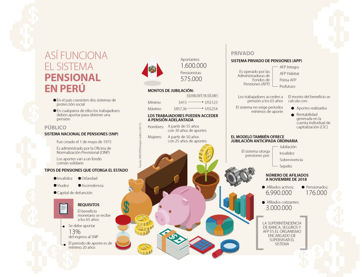 En el caso del SNP, que es operado por la Oficina de Normalización Provisional (ONP), los aportes de los cotizantes van a un fondo común solidario. Para recibir la pensión un trabajador peruano debe haber aportado al menos 13% de su sueldo mensualmente por un periodo no inferior a 20 años. Además, el Gobierno Nacional ha establecido unos montos mínimos y máximos de jubilación. El más bajo de ellos se ubica sobre S/415 soles, un poco más de US$127, y el más alto, ronda los S/857 soles. Es decir, cerca de US$256.