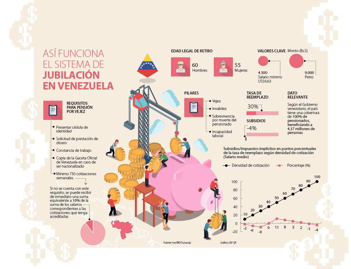 En el régimen de pensiones, Venezuela también contempla los casos de invalidez, incapacidad laboral o sobrevivencia por muerte del pensionado que accedía antes a ese beneficio. Para pensionarse, la edad mínima que estipula el Gobierno es de 60 años para los hombres y 55 años para las mujeres. No obstante, García comentó que uno de los requerimientos para obtenerla es haber trabajado 25 años.