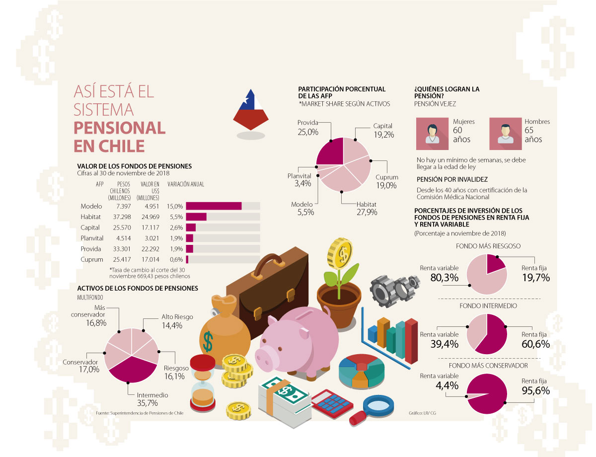 Desde Augusto Pinochet, Chile presentó uno de los modelos financieros que más se han expandido por el continente. Se trata el de los Fondos Privados o las famosas AFP, dedicadas a recibir un recaudo mensual por parte de los empleados de organizaciones para así utilizar ese dinero en inversiones; finalmente cuando las personas lleguen a su edad de jubilación (60 años, mujeres y 65, hombres), recibirán ese ahorro con la rentabilidad que se logró durante ese periodo de trabajo.