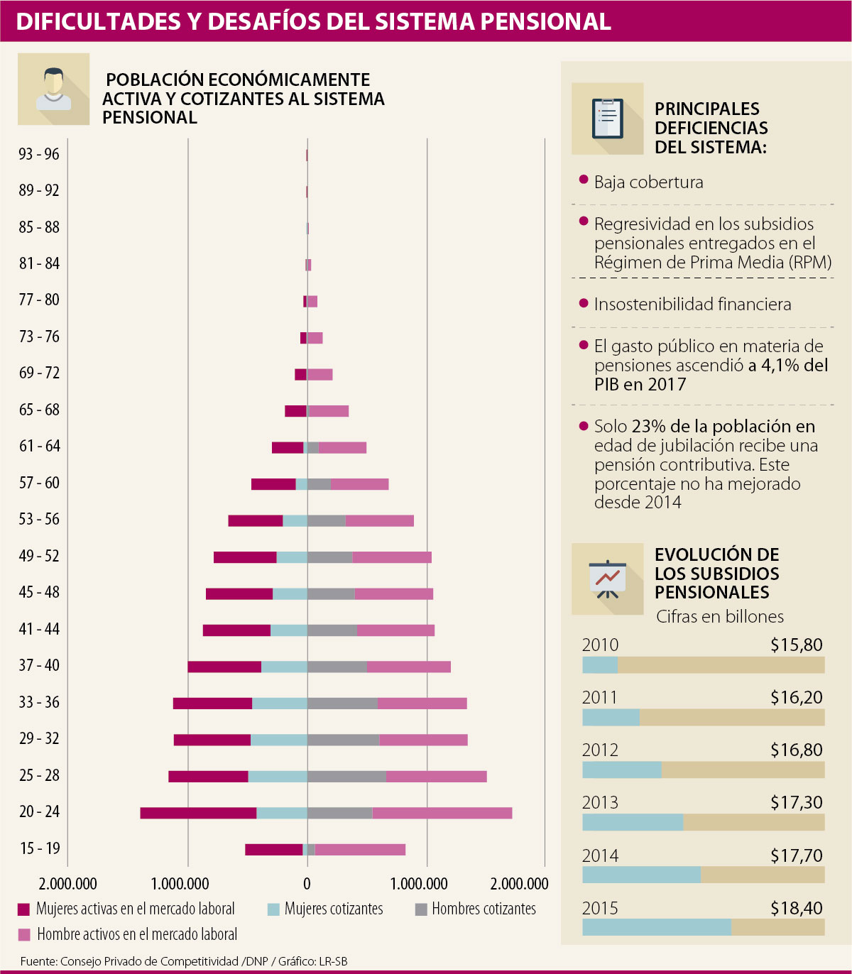 A pesar de que en los últimos años ha aumentado el número de contribuyentes, desde 2014 la población que recibe una pensión contributiva se mantiene en 23%; en cuanto a los subsidios, según el Departamento Nacional de Planeación (DNP), en 2015 alcanzaron la cifra de $18,4 billones, y cifras de Fedesarrollo detallan que 10% de la población en edad de vejez no cuenta con Sisben ni ahorros, que 27% es beneficiaria del programa Colombia Mayor y 40% figura bajo devolución de saldos, indemnización sustitutiva o Beneficios Económicos Periódicos (Beps). Bajo este panorama, 77 % de los colombianos que recibe algún ingreso para la vejez está por debajo de un salario mínimo.