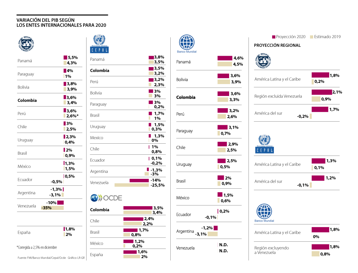 Aunque en la Ocde no están todos los países latinoamericanos, incluyen en data independiente las cifras de algunos países y esos son: Colombia (3,5%), Chile (2,4%), Brasil (1,7%), México (1,2%). Por ser un informe de periódicos iberoamericanos, incluimos en este reporte a España, cuyo proyección de crecimiento para 2020 es de 1,6%, esto es 0,4 puntos porcentuales menos a ese 2% de crecimiento del PIB calculado para 2019.