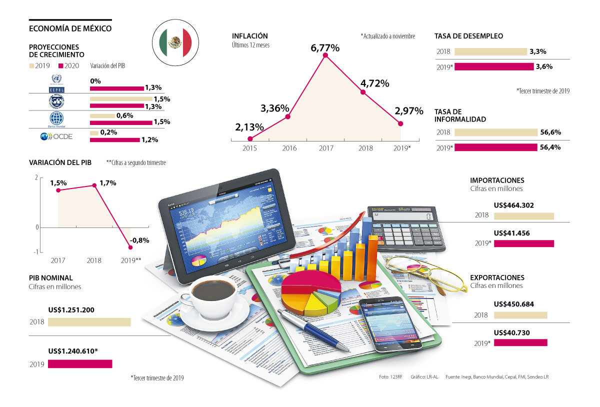 Tanto el Fondo Monetario Internacional como la Cepal tienen proyectado que el PIB de México crecerá 1,3%, mientras que el Banco Mundial es mucho más optimista y fija esa cifra en 1,6%.
