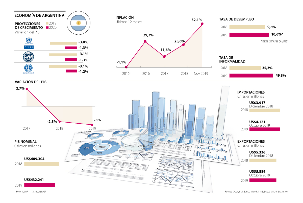 Estas cifras, las primeras de una extensa lista, son suficientes para que el escenario económico que dejó Mauricio Macri sea poco alentador este año: las proyecciones de los organismos internacionales apuntan a que el PIB argentino se contraiga 3%. Y aunque en menor medida lo hará para 2020, la perspectiva negativa se mantiene. Macri recibió un país con un crecimiento del PIB de 2,7%, y las estimaciones para 2020 de la Ocde, el FMI y el Banco Mundial son de -1,3%, -1,3% y -1,2%, respectivamente.