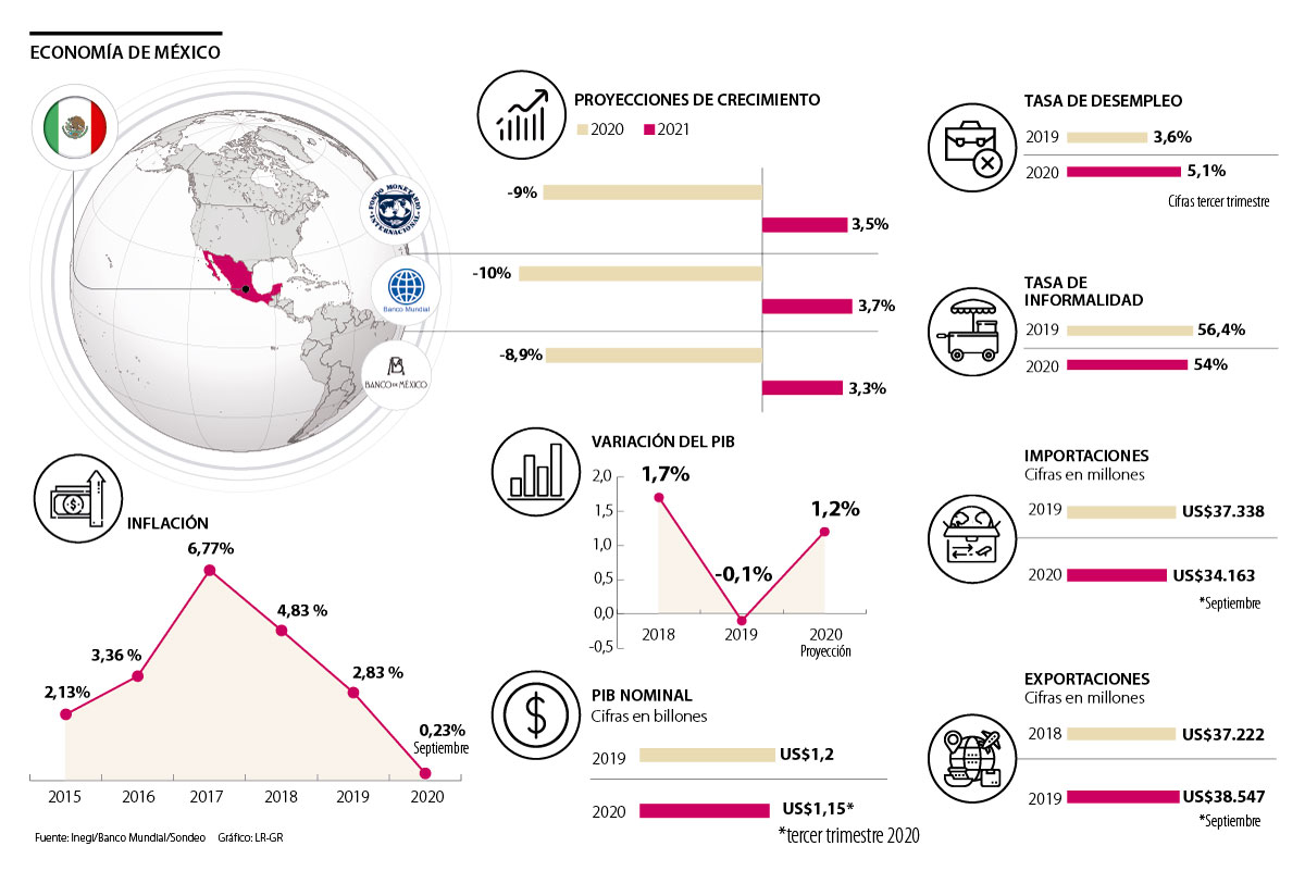 Precisamente, en los últimos informes de proyecciones económicas del Fondo Monetario Internacional, el Banco Mundial y el Banco Central, se resalta que la economía mexicana registrará un crecimiento en 2021 de 3,5%, 3,7% y 3,3%, respectivamente.