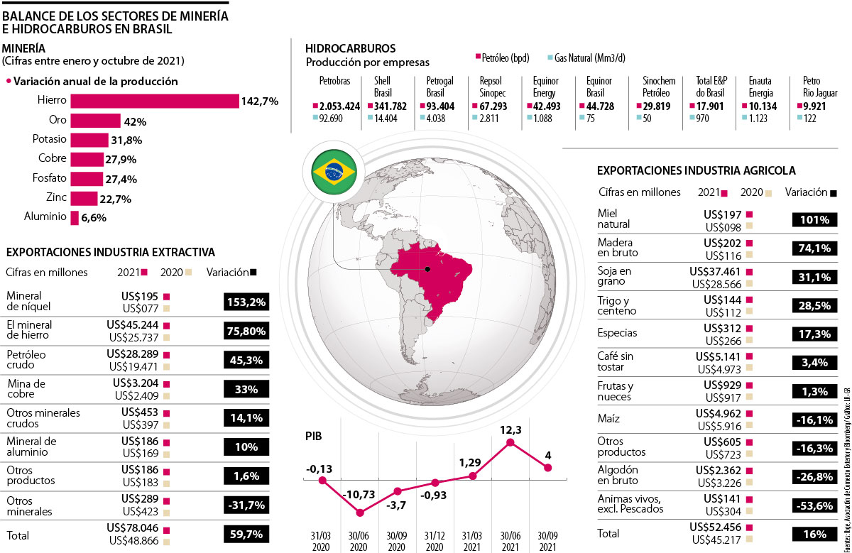 Datos de la Asociación de Comercio Exterior de Brasil (AEB) aseguran que, gracias al fuerte aumento de los precios de las materias primas, especialmente el mineral de hierro, el petróleo crudo y la soja, las exportaciones proyectadas de US$270.051 millones, de implementarse, deberían superar el récord de US$256.041 millones obtenido en 2011, es decir, hace 10 años.
