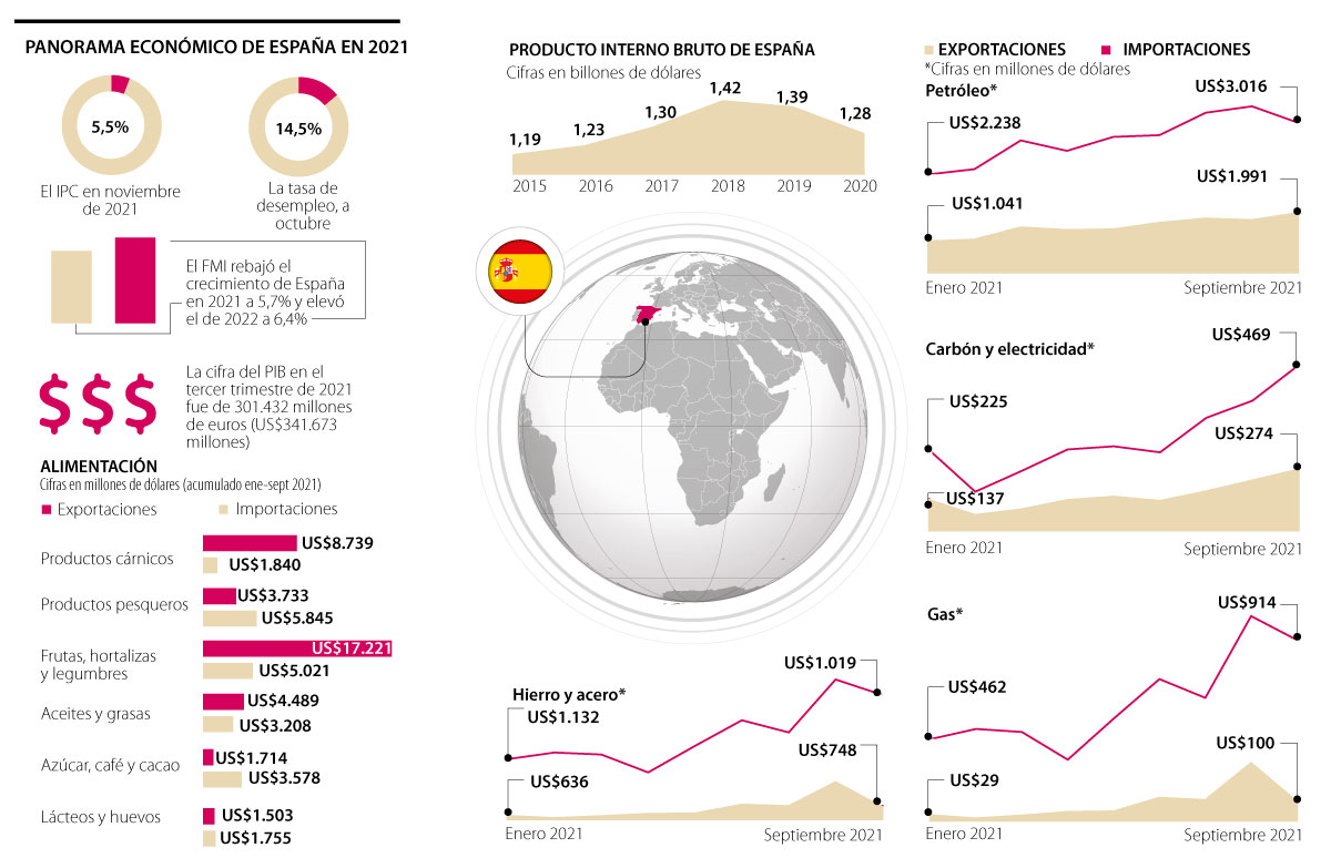 La balanza exportadora de España rompió récords durante 2021, dándole un impulso a la recuperación. Para noviembre, por ejemplo, la cifra llegó a $229.963 millones (unos US$259.827 millones) a corte de septiembre, superando incluso los niveles prepandemia. Los productos químicos fueron los de mayor peso, 18,5%; seguidos por los bienes de equipo, 18,1%; alimentos, bebidas y tabaco, 15,9% y producción automotriz, 13,5%, según cifras del Ministerio de Industria, Comercio y Turismo.