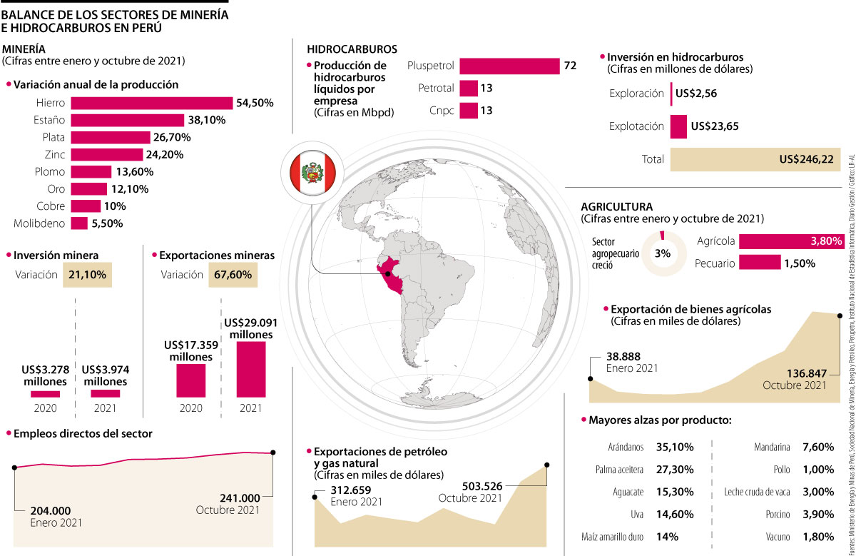 Aunque Perú fue uno de los países con el desempeño económico más bajo durante la pandemia, ahora parece que vuelve a tomar vuelo, pues según informó el Inei de ese país, el PIB del tercer trimestre creció 11,4% frente al mismo periodo del año anterior, y 1,4% por encima de 2019, es decir, del tiempo de prepandemia. Un factor importante a resaltar es la actividad que más genera dinamismo, y ahí la minería y los hidrocarburos juegan un papel esencial, pues representan 60% de las exportaciones totales del país Inca.