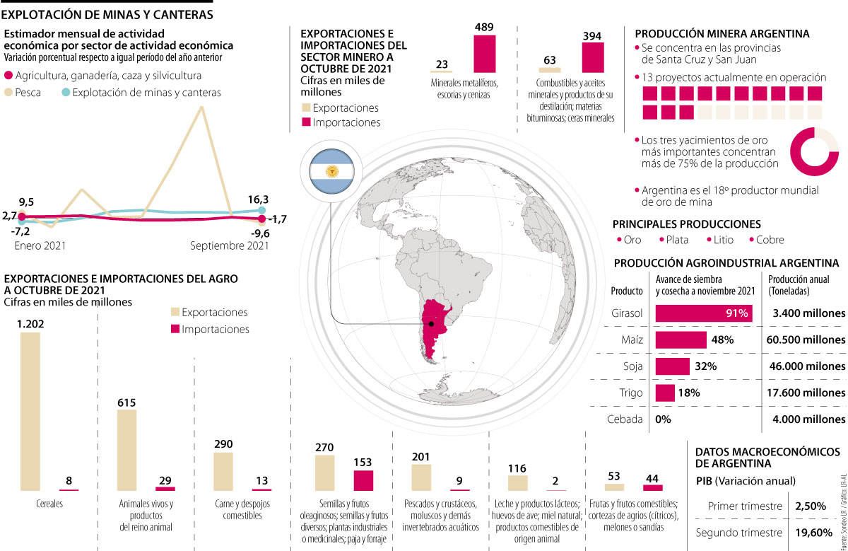 Según el Monitor de Estimaciones Agrícolas del Ministerio de Agricultura, Ganadería y Pesca, a noviembre, las principales producciones del agro argentinas: girasoles, maíz, soja, trigo y cebada, sumaban 131.500 millones de toneladas en producción. La soja es uno de los principales cultivos del país gaucho, según el Indec. En octubre de 2021, las exportaciones netas de los principales productos y subproductos derivados del cultivo de la soja registraron una utilidad de US$1.731 millones, US$647 millones superior al mismo período del año anterior. Esto se debió a un alza de US$612 millones en las exportaciones y una caída de US$35 millones en las importaciones. La exportación de octubre de 2021, que determinó el alza de las exportaciones de la región, fue el maíz en grano, con un aumento de US$488 millones.