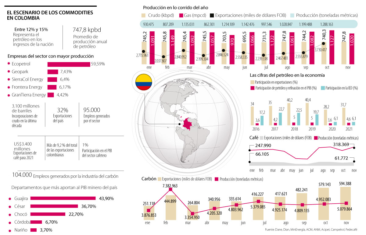 En un año marcado por un paro nacional de más de 40 días y el proceso de reactivación económica tras los duros impactos del covid-19, los sectores productivos han tenido un balance agridulce en Colombia. En el caso de los commodities, si bien se vieron beneficiados de los buenos precios, al tiempo sufrieron una caída de la producción.
