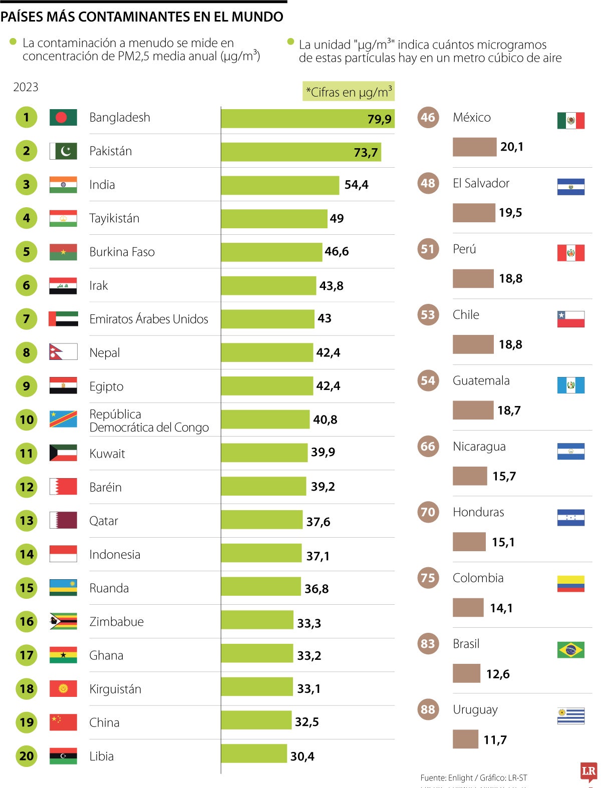 Un estudio de Enlight, evalúa cuáles son los países más contaminantes, a través de una medición que estudia la concentración de materia particulada, PM2,5 media anual (MYg/m3). Esto mide la cantidad promedio de partículas muy pequeñas de CO2 y otros gases tóxicos en el aire durante un año.