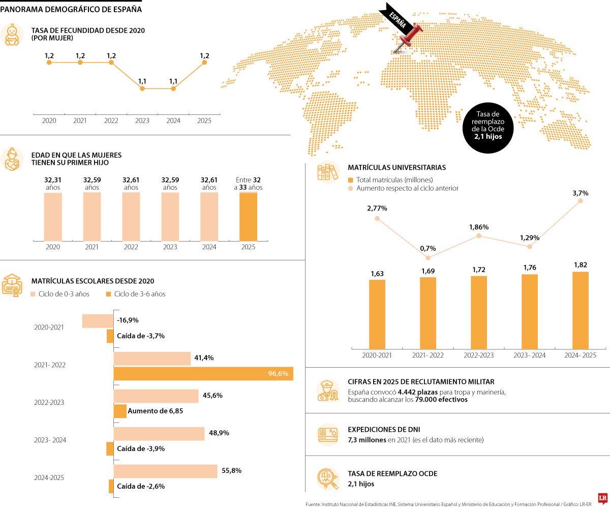 España, al igual que otros países en la actualidad, está sufriendo una de las crisis de natalidad más complejas de toda la historia. Un fenómeno, que de hecho se ve reflejado no solo en la caída sostenida en su tasa de fecundidad, sino en los retrasos históricos en la maternidad, en la contracción de la población infantil y en el impacto directo de los sistemas educativos y de defensa.