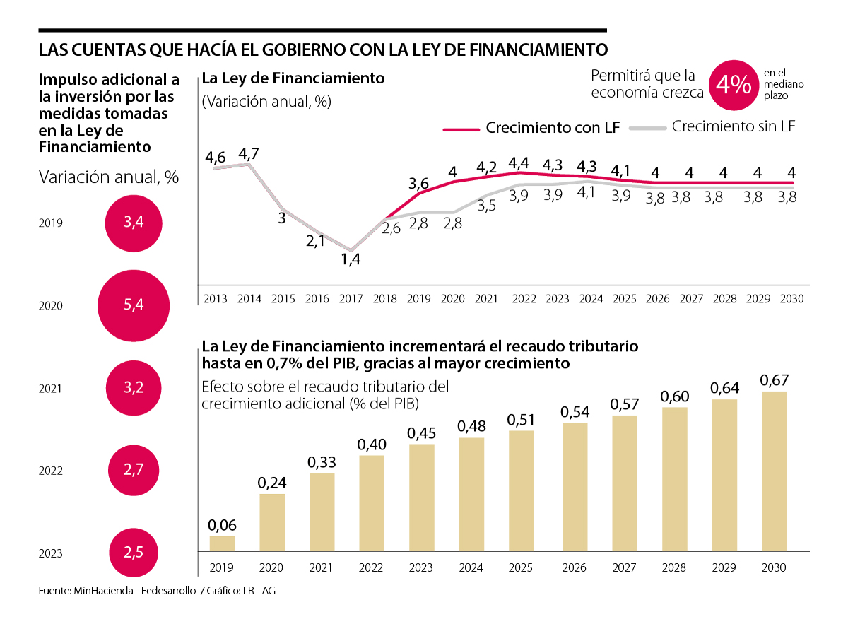 Con la Ley de Financiamiento, el Gobierno esperaba que se diera un un efecto adicional sobre la inversión de 3,4 puntos porcentuales por año. Los cálculos para este año son que este rubro creciera 3,4% y llegue a subir 5,4% en 2020, gracias a que algunas de las medidas que contiene la Ley entraban a regir ese año. Así se pronosticaba en el Marco Fiscal de Mediano Plazo que se presentó en junio. “La reducción que experimentarán a partir de este año las empresas en el costo de invertir, gracias a la Ley de Financiamiento, representará un importante impulso a la inversión”, dijo en su momento el ministro Carrasquilla.