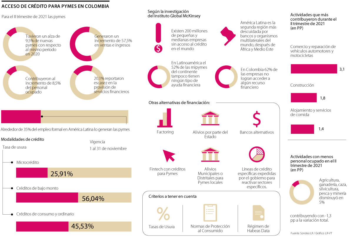 La Encuesta Periódica de Micronegocios (Emicron) demostró que entre mayo y julio de 2021, un 20,1% de los micronegocios en el país reportó escasez en la provisión de servicios financiero, cifra que ha descendido desde diciembre de 2020. Ahora, en cuanto a las Pyme en general el reto sigue siendo grande, ya que por ejemplo, la CAF, evidenció en un estudio que entregó en agosto que los créditos a las Pyme, como porcentaje de la cartera de préstamos, representan aproximadamente la mitad del total en los países de la Ocde, y en los emergentes como Colombia no superan 26%.