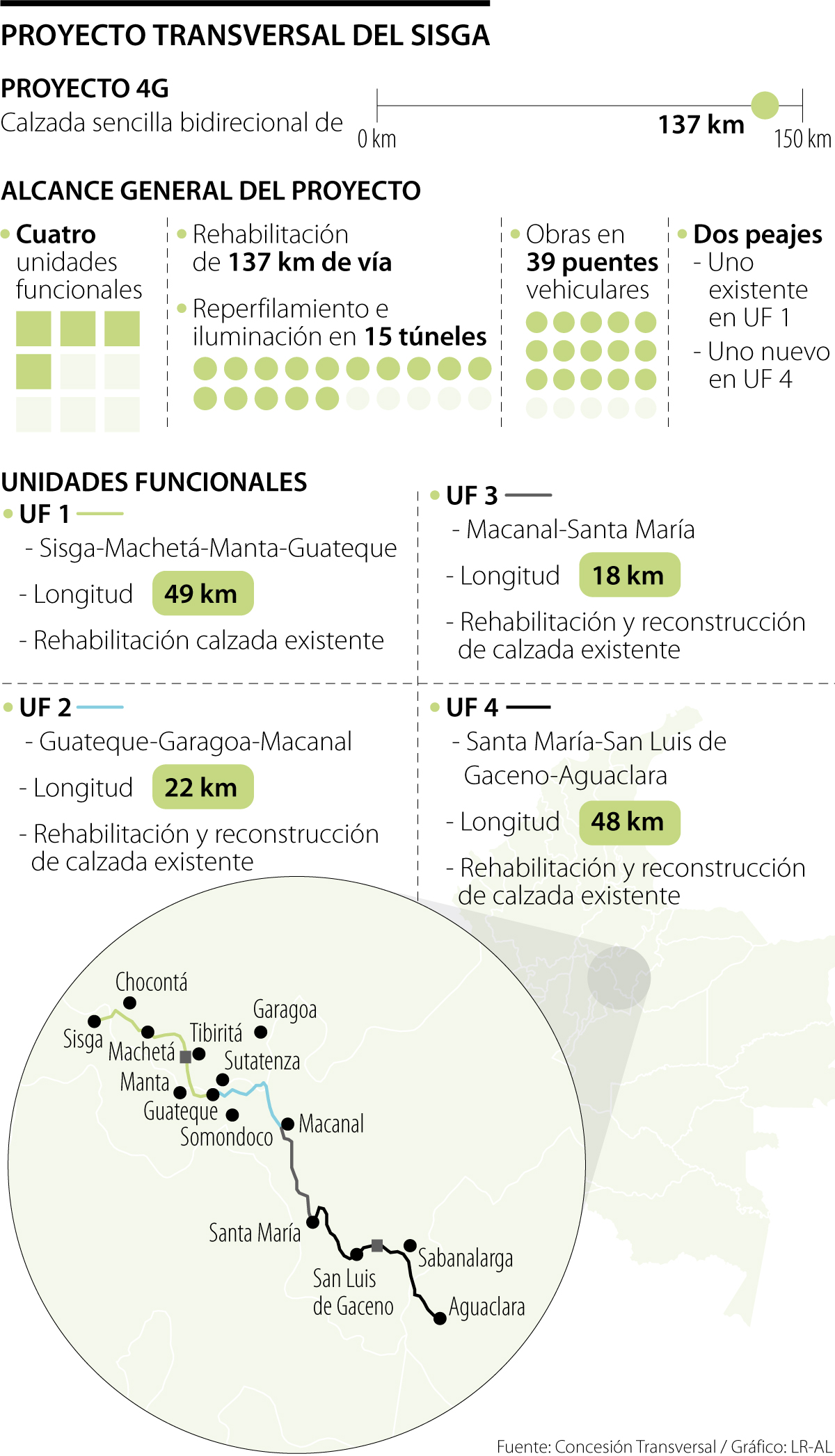 Cabe recordar que este proyecto, que hace parte del programa de concesiones 4G, contempla la rehabilitación y pavimentación de 137 km de una calzada bidireccional, dividida en cuatro unidades funcionales (UF), que van desde Chocontá (Cundinamarca), a la altura de la Represa del Sisga, hasta la vereda de Aguaclara, del municipio Sabanalarga (Casanare).