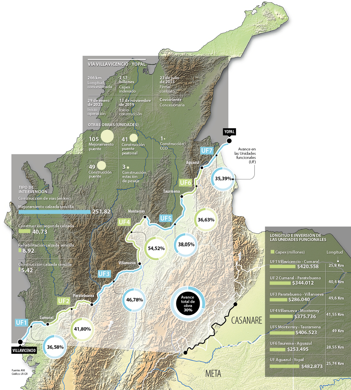 La totalidad de la obra concesionada está dividida en siete unidades funcionales (UF), distribuidas de la siguiente manera: la UF1, Villavicencio - Cumaral, que registra un avance de 36,58%, tiene una longitud de 25,8 km y una inversión capex de $420.558 millones; y la UF 2, Cumaral - Paratebueno, que reporta un avance de 41,8% en sus los 40,4 km de longitud y tiene un costo de $344.012 millones.