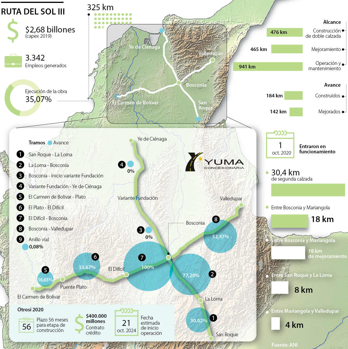 De los nueve tramos que componen la Ruta del Sol III, el siete, El Difícil - Bosconia, ya está concluido. Le siguen, en avance de ejecución: el dos, La Loma - Bosconia, con 772%; el ocho, Bosconia - Valledupar, con 52,47%; el seis, Plato - El Difícil, con 33,67%; el uno, San Roque - La Loma, con 30,02%; y el cinco, El Carmen de Bolívar - Plato, con 16,63%.