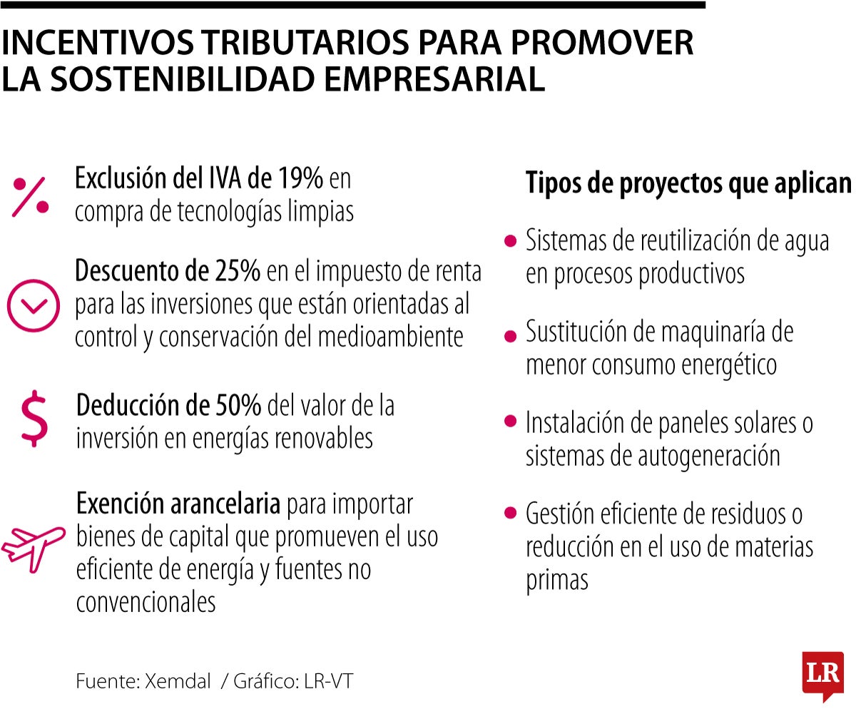 “También hay beneficios de un descuento tributario cuando se hacen inversiones en el mejoramiento del medioambiente: hay un retorno de 25% del valor invertido; es importante tener en cuenta que la inversión debe hacerse por voluntad propia, no por la imposición de una autoridad o licencia. La norma otorga una exención arancelaria para importar bienes.