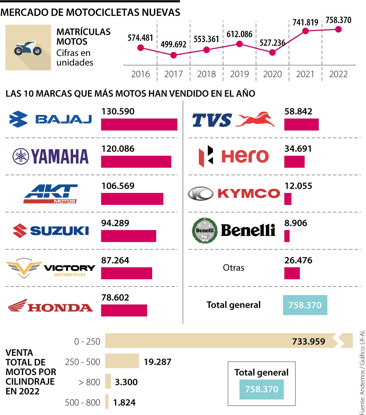 Lo interesante es que en el listado general de ventas proporcionado por Andemos, las dos primeras marcas que muestran su poderío, lo hacen con cifras contundentes: Bajaj (130.590) y Yamaha (120.086); aunque, en general, todas contribuyen a darle una serie de herramientas al posible comprador, al momento de adquirir uno de estos vehículos cero kilómetros, para satisfacer necesidades, gustos y hasta presupuestos: AKT (106.569), Suzuki (94.289), Victory (87.264), Honda (78.602), TVS (58.842) y Hero (34.691).