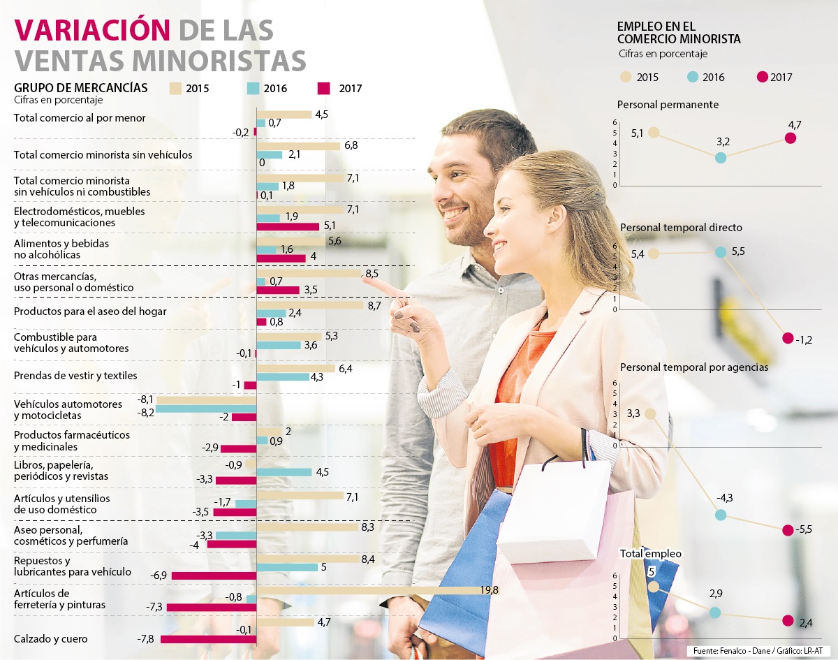 La variación de la producción y las ventas este año para muchos sectores del comercio minorista fue poco alentadora. La Federación Nacional de Comerciantes (Fenalco) informó que a septiembre de 2017 el crecimiento de las ventas fue de cero, incluso muchos renglones como vehículos, repuestos, motos, ferreterías, materiales de construcción, cuero y calzado presentaron decrecimientos.
