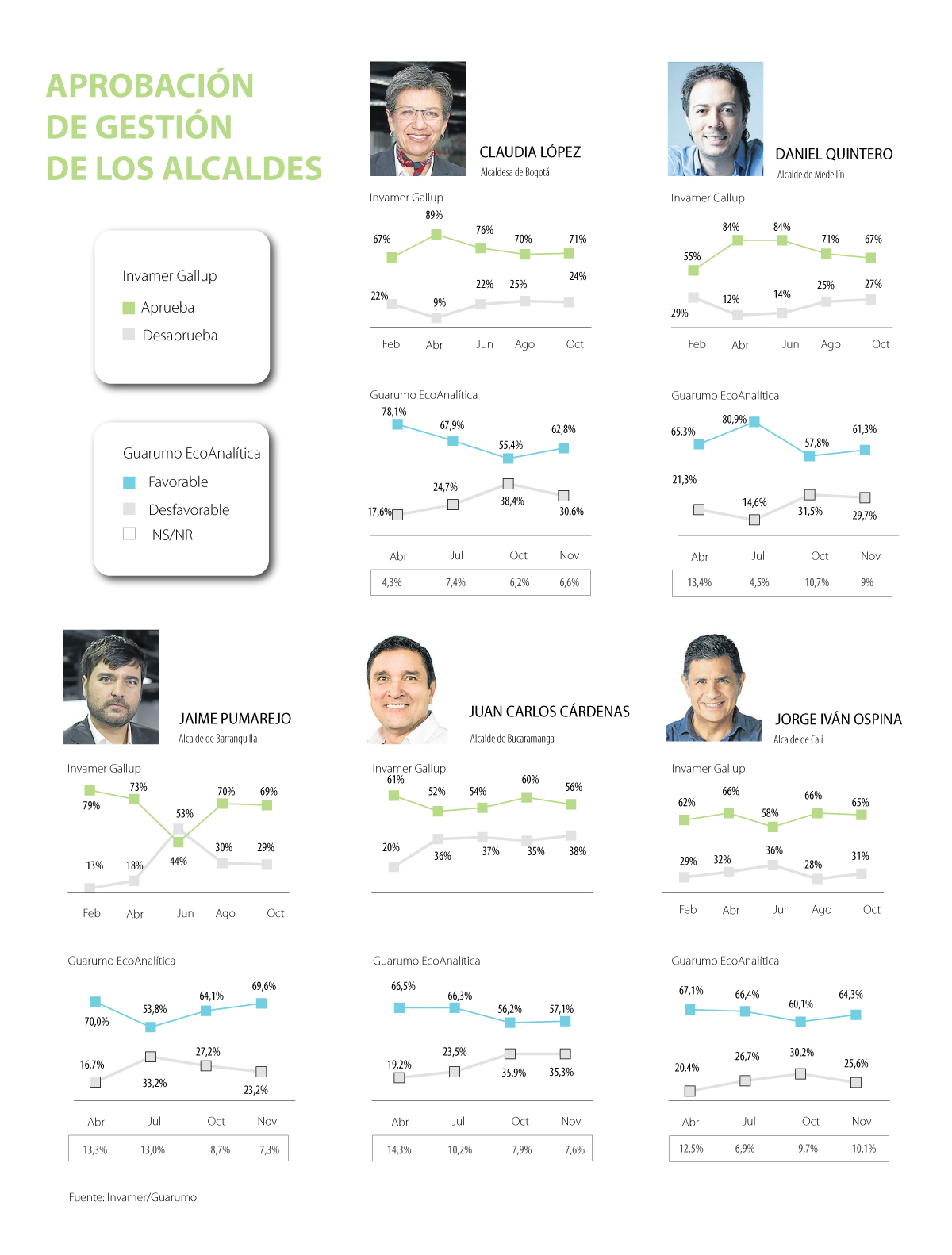 En Bogotá, Claudia López empezó su mandato con una popularidad de 67%, de acuerdo con la medición de Invamer Gallup de febrero. Su manejo de los primeros días de la pandemia, cuando tomó la iniciativa de decretar un simulacro de aislamiento para poner a prueba la ciudad y sus habitantes bajo esas condiciones, disparó su imagen, que llegó en abril a 89% en la encuesta de Invamer Gallup y a 78,1% en la de Guarumo EcoAnalítica. Desde ese punto la mandataria ha venido sufriendo el desgaste normal de los gobiernos y su favorabilidad ha venido cayendo, sin embargo, destaca que en todos los puntos su aprobación ha doblado su desaprobación.