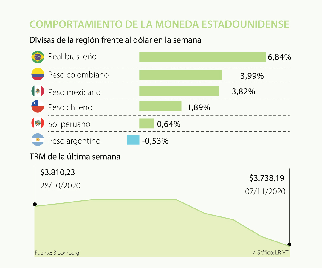 En el caso de las principales monedas de la región, si se observa el comportamiento de la semana, todas las divisas se apreciaron frente al dólar. Según el balance de Bloomberg, a excepción del peso argentino, las monedas de México, Colombia, Brasil, Chile y Perú se fortalecieron frente al dólar.