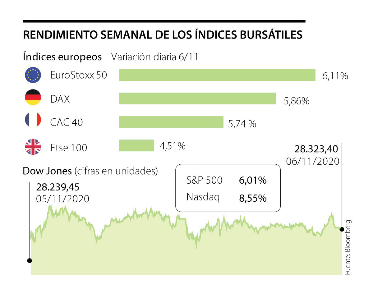 Los principales índices en Europa y en Estados Unidos acumularon ganancias en la semana, a pesar de la incertidumbre que generó el conteo de los votos, que hizo que se tomarán más de cinco días saber quién era el próximo presidente de Estados Unidos, y pese al comportamiento mixto que tuvieron el viernes.