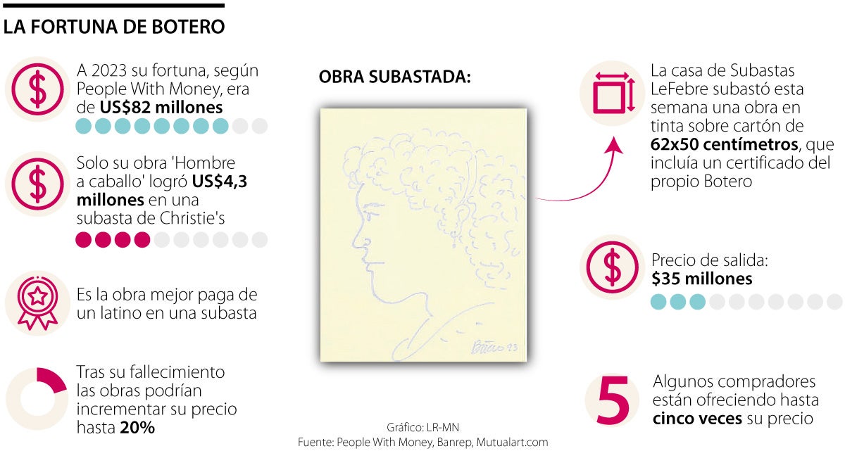 Si bien, la bolsa del ‘boterismo’ fue significativa, esta seguiría sumando, pues se estima que luego de su fallecimiento sus obras puedan aumentar el precio hasta 20%. En LeFebre, por ejemplo, esta semana se subastó un dibujo de tinta sobre cartón hecho en 1993, el precio de salida fue de $35 millones y, dice Martínez, compradores la han llamado a ofrecerle hasta cinco veces ese precio, para quedarse con la obra.