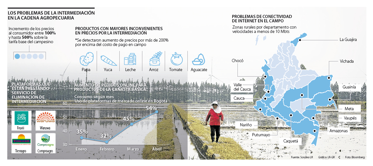 Solo en Bogotá, en enero, 35% de las compras del mercado de canasta básica, se hacían por plataformas digitales, y en abril, en mitad del aislamiento preventivo, este indicador ya iba en 54%. “Es el reflejo de que las personas empezaron a acudir más al domicilio pero eso dio la oportunidad para que aplicaciones como las que buscan la eliminación de intermediarios en el agro, fueran una opción para los consumidores”, dijo Román Bauer, director de la consultora ambiental América Natural.