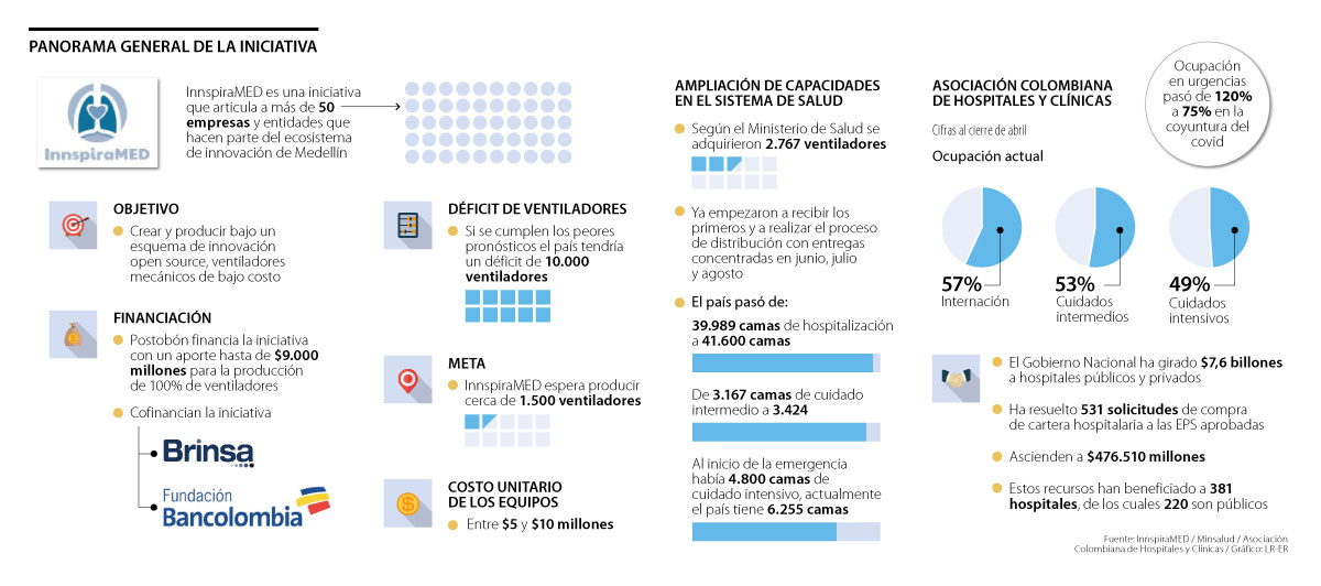 InnspiraMED es un proyecto que articula a más de 50 empresas y entidades que hacen parte del ecosistema de innovación de Medellín. Es el resultado de la unión entre universidad, empresa y Estado. Su objetivo es crear y producir bajo un esquema de innovación open source, ventiladores mecánicos de bajo costo que asistirán a pacientes que estén en condición crítica por el virus.