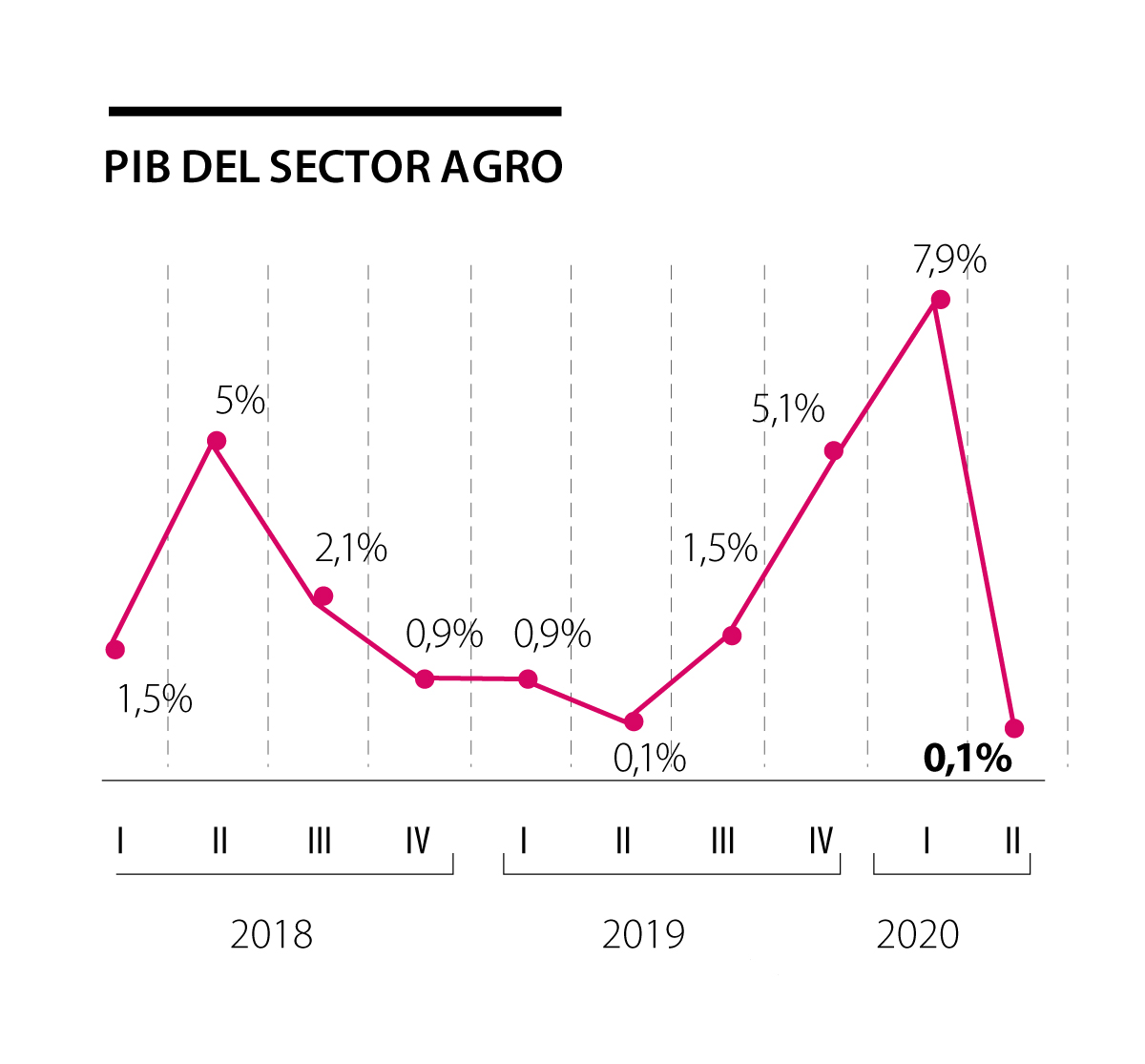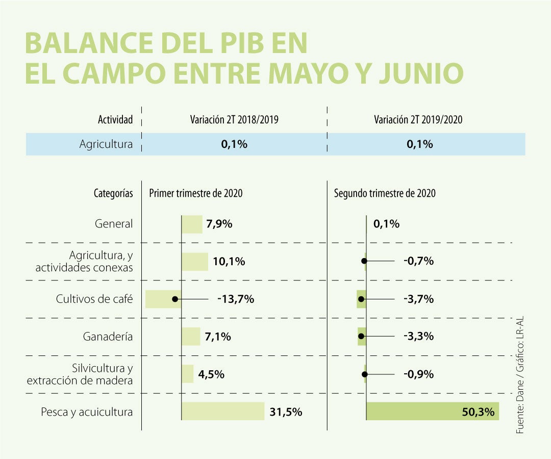 El sector agro tuvo un crecimiento de 0,1%. El trimestre pasado había sido el jalonador de la economía con una variación de 7,9%. Para Augusto Solano, presidente de Asocolflores, el sector fue uno de los pocos que pudo seguir operando durante la cuarentena, sin embargo, productos como las flores ha sido golpeado por el cierre de mercados internacionales. Además, la clausura de restaurante y hoteles también ha sido una afectación a pequeños productores.