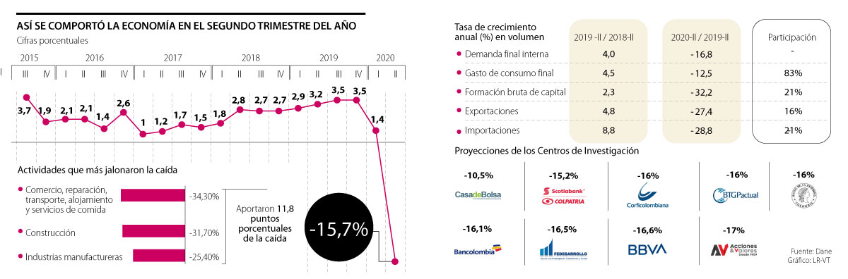 Tal y como pronosticaban los actores económicos del país, el Producto Interno Bruto en el segundo trimestre del año cayó hasta 15,7%, una cifra que reflejó el daño que causó el confinamiento y la parálisis de la mayoría de los sectores económicos entre abril y mayo, principalmente, y que temían los centros de pensamiento y gremios.