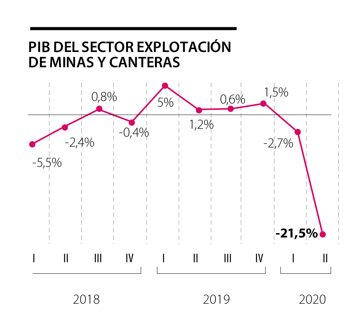 La contracción de la explotación de minas y canteras fue de -21,5%. Juan Camilo Nariño, presidente de Asociación Colombiana de Minería, manifestó que la caída histórica en los precios del carbón, la reducción en la demanda del sector de la construcción y las restricciones de movilidad entre municipios afectaron el comportamiento del sector. “Hemos visto una alta afectación en el carbón que además de la coyuntura ha visto una activismo judicial que ha frenado las operaciones”.