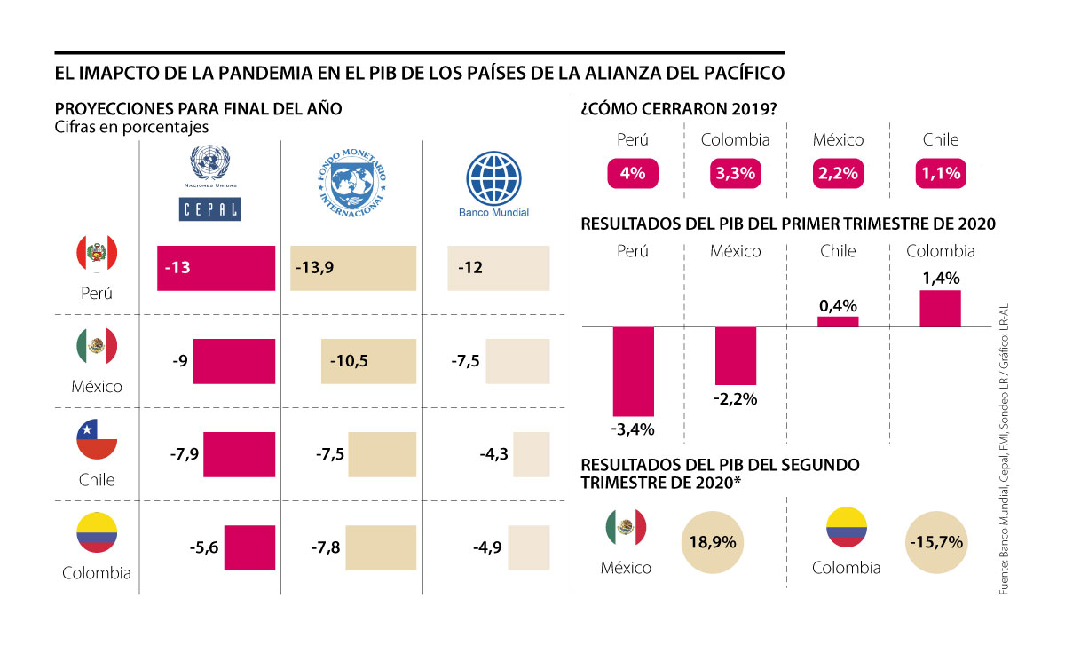 Mientras que el Fondo Monetario Internacional proyecta que la economía de Perú se contraerá 13,9% al cierre del año, la de México, 10,5%; la de Chile, 7,5; y la de Colombia, 7,8%.