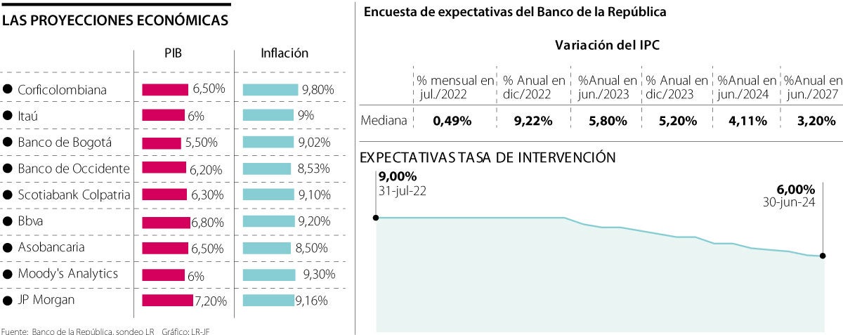Precisamente, los analistas consideran que la inflación va a continuar en rangos elevados. Bbva Research estima que a cierre de año el IPC esté en 9,2% y en 2023 se irá moderando hacia 5%, aún por fuera del rango meta del Emisor.
