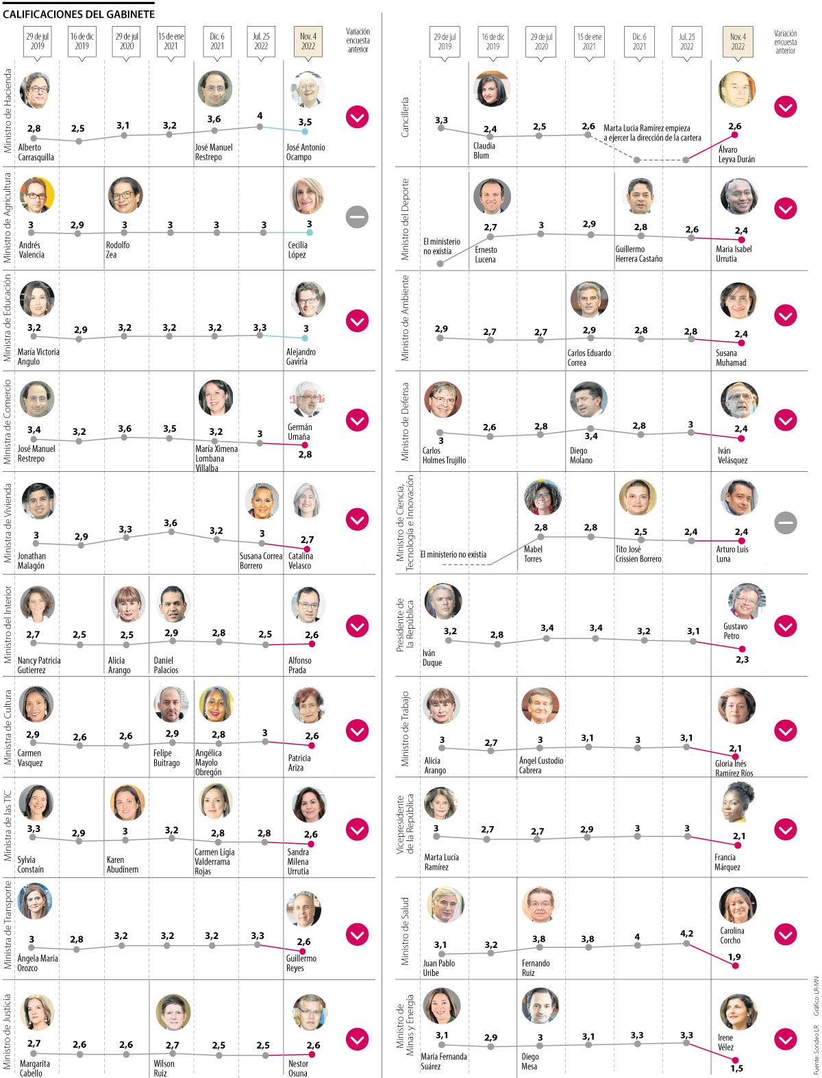 En la última parte de la tabla, en la que se puede decir que todos los ministros allí presentes ‘se rajaron’ en el sondeo, estuvieron las nueve carteras restantes y su calificación fue desde 2,4, como la más alta, hasta 1,5, que fue el piso.