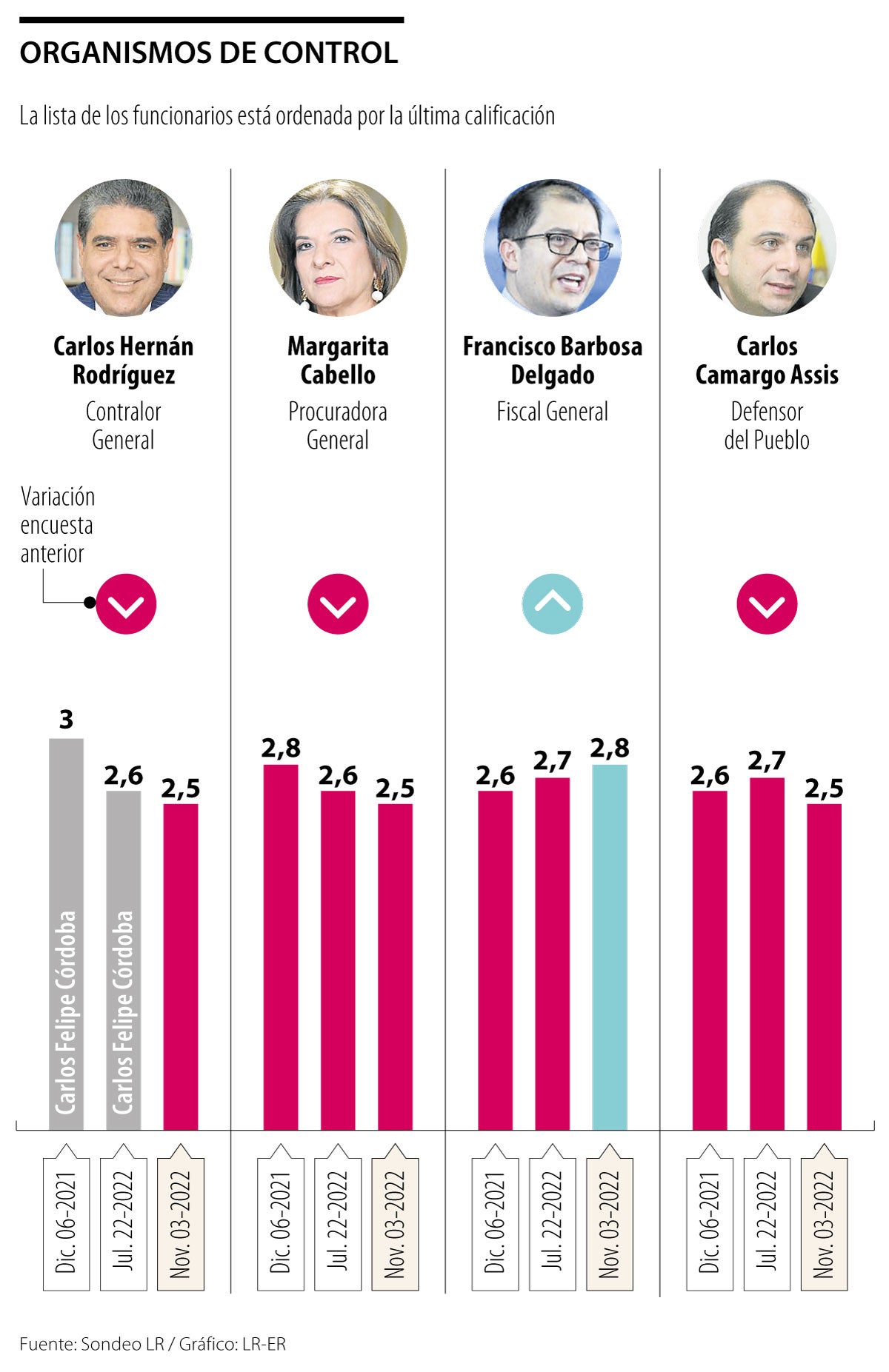 El contralor general, Carlos Hernán Rodríguez, por su parte, aparece en la Encuesta por primera vez y obtuvo un resultado igual a los dos funcionarios previamente mencionados. Cabe recordar que, en la medición anterior, el contralor general era Carlos Felipe Córdoba, quien obtuvo un puntaje de 2,6.