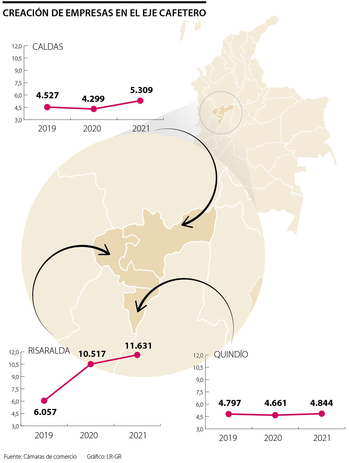 Según cifras de la Cámara de Comercio de Manizales por Caldas, en 2021 se crearon 5.309 empresas en toda la jurisdicción, una variación de 23,5% en comparación con 2020 donde se crearon 4.299 empresas.