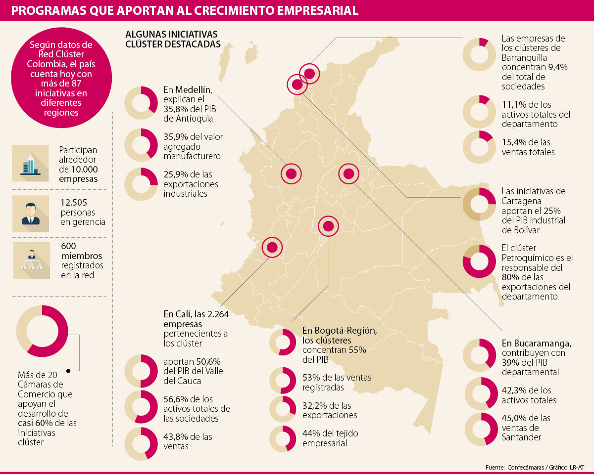 Según datos de Red Clúster Colombia, el país cuenta con más de 87 iniciativas en diferentes regiones en las cuales participan cerca de 10.000 empresas, y más de 20 Cámaras que apoyan el desarrollo de casi 60% de las iniciativas clúster.