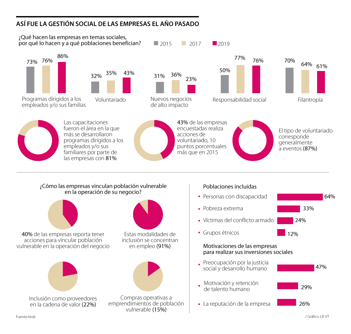 La encuesta mostró, además, que al realizar iniciativas enfocadas en los trabajadores y sus familiares, las compañías se enfocan en capacitaciones, con 81% de participación. El informe reveló que las inversiones sociales de las compañías colombianas durante el año pasado también estuvieron dirigidas a la mitigación de impactos del negocio (76%), donaciones (61%), voluntariado (43%) y a nuevos negocios de alto impacto social positivo (23%).