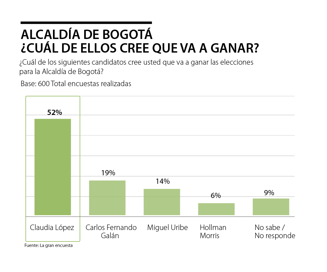 Respecto a quién cree que será el alcalde de la capital, 5 de cada 10 bogotanos considera que la ganadora será Claudia López, mientras que cerca de dos de cada 10 considera que el cargo será ocupado por Galán. Solamente 14% cree que el ganador será Uribe y 6% piensa que será Morris.