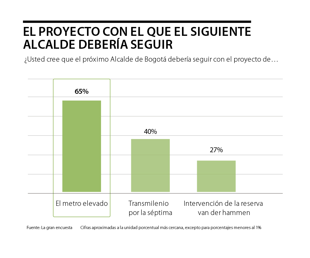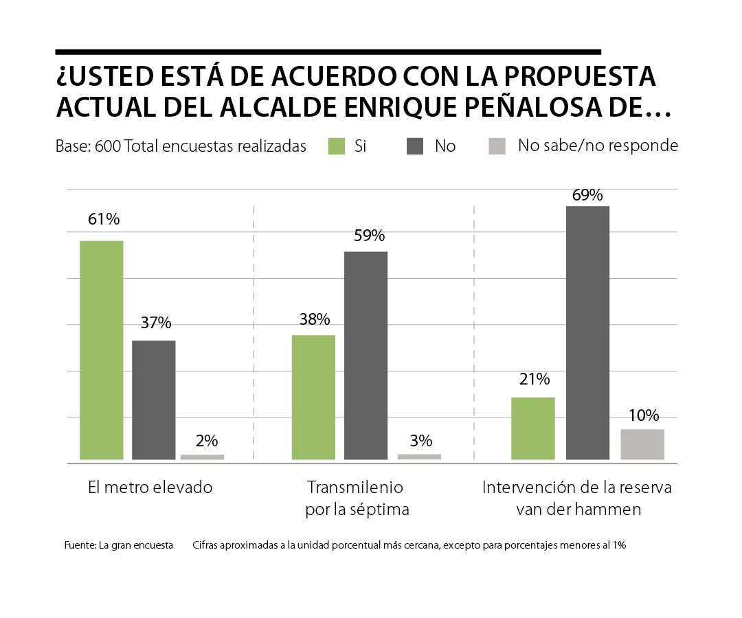 Entre los proyectos que tendrá que seguir el sucesor de Enrique Peñalosa está la construcción del metro para la ciudad. Según la Gran Encuesta, 61% de los consultados está de acuerdo con el metro elevado, mientras que 37% no lo está.
