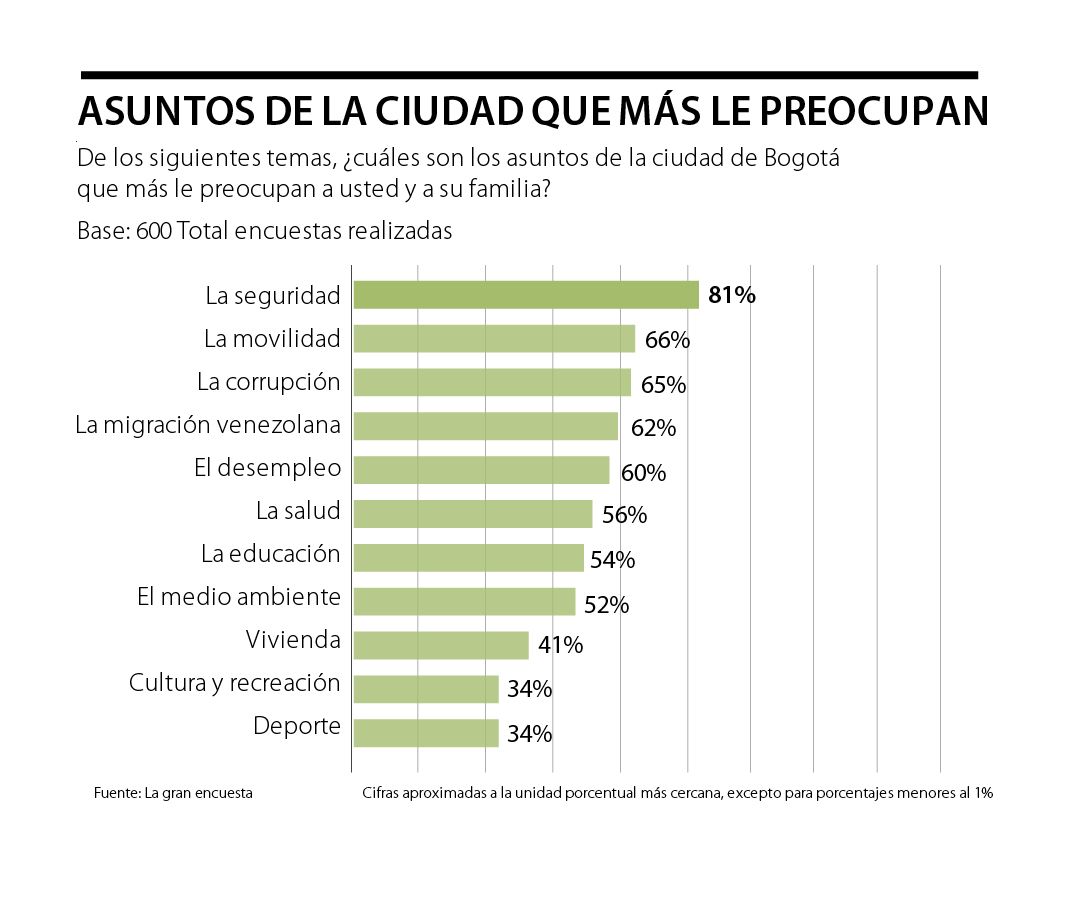 La Gran Encuesta también revela que la migración venezolana, con 62%, es el cuarto tema que más les preocupa a los bogotanos, mientras que el desempleo cierra el top 5. Vale recordar que según las cifras que entregó esta semana el Departamento Administrativo Nacional de Estadística (Dane) el desempleo en la capital del país llega a 10,3%.