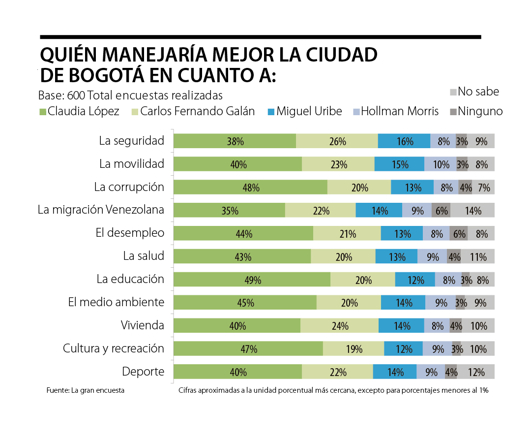 En donde mejor sale parada es en la educación (49%). En el caso de Carlos Fernando Galán su manejo a los problemas de seguridad muestra su mejor desempeño (26%), al igual que Miguel Uribe (16%). La movilidad, con 10%, es donde a Hollman Morris le va mejor.