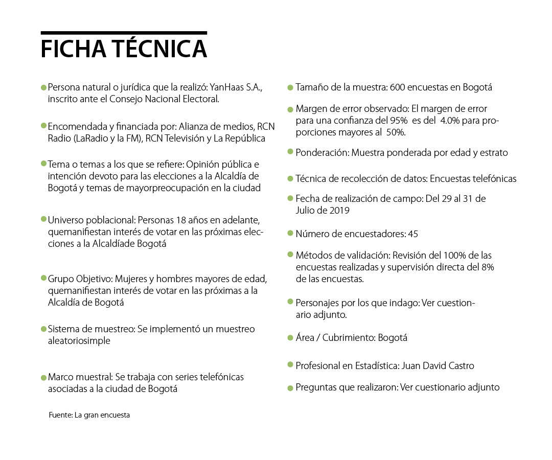 De acuerdo con los resultados de la Gran Encuesta, realizada por Noticias RCN, La FM, RCN Radio y LR, quienes lideran en intención de voto en la contienda por la Alcaldía de Bogotá son Claudia López, con 42%; el voto en blanco, con 22%, y Carlos Fernando Galán, con 16%.