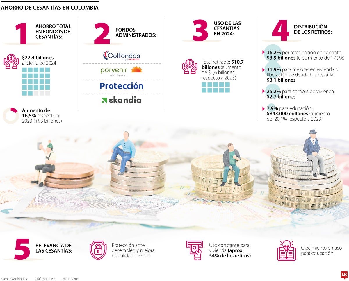 Además, en 2024, el uso de las cesantías por parte de los trabajadores llegó a $10,7 billones, lo que representa un aumento respecto a $9,1 billones retirados en 2023. Este monto se distribuyó en varios fines, destacándose los relacionados con la protección frente al desempleo y el mejoramiento de la calidad de vida.
