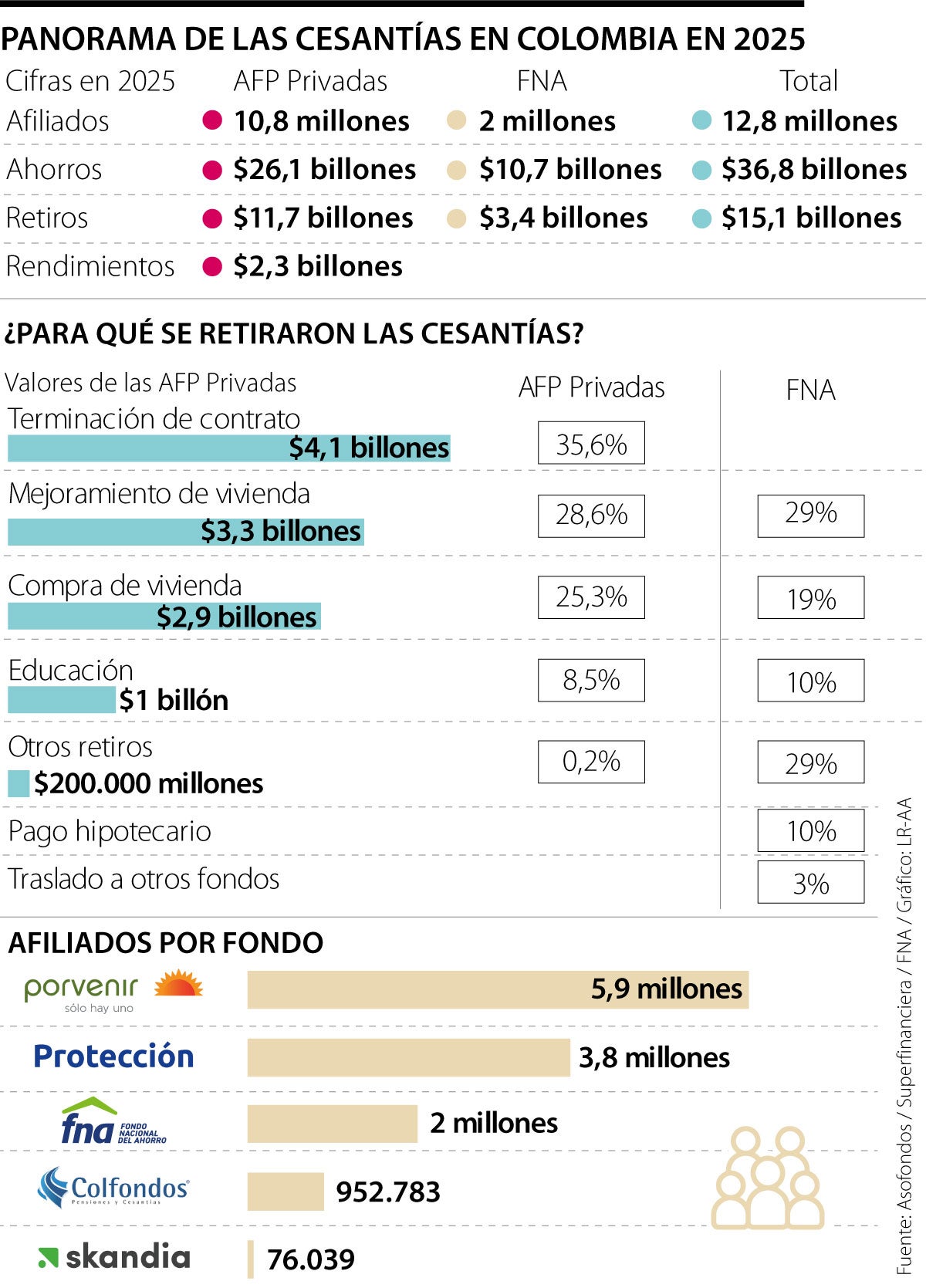 En Colombia, hay 12,8 millones de afiliados a los fondos de cesantías privados y el Fondo Nacional del Ahorro, FNA. Durante 2025, estos trabajadores, ahorraron $26,1 billones en las AFP privadas, y $10,7 billones en el FNA, para un total de $36,8 billones de cesantías con corte a diciembre 31 de 2025, según reportaron Asofondos y el FNA.