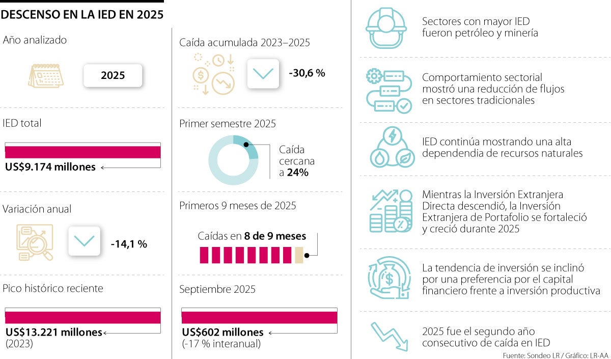 La IED cerró en 2025 con un total de US$9.174 millones y una caída de 14% respecto a 2024. Sumando los dos años, se registró un descenso acumulado cercano a 30%, que dista de 2023, donde se alcanzó la cifra de US$13.321 millones.
