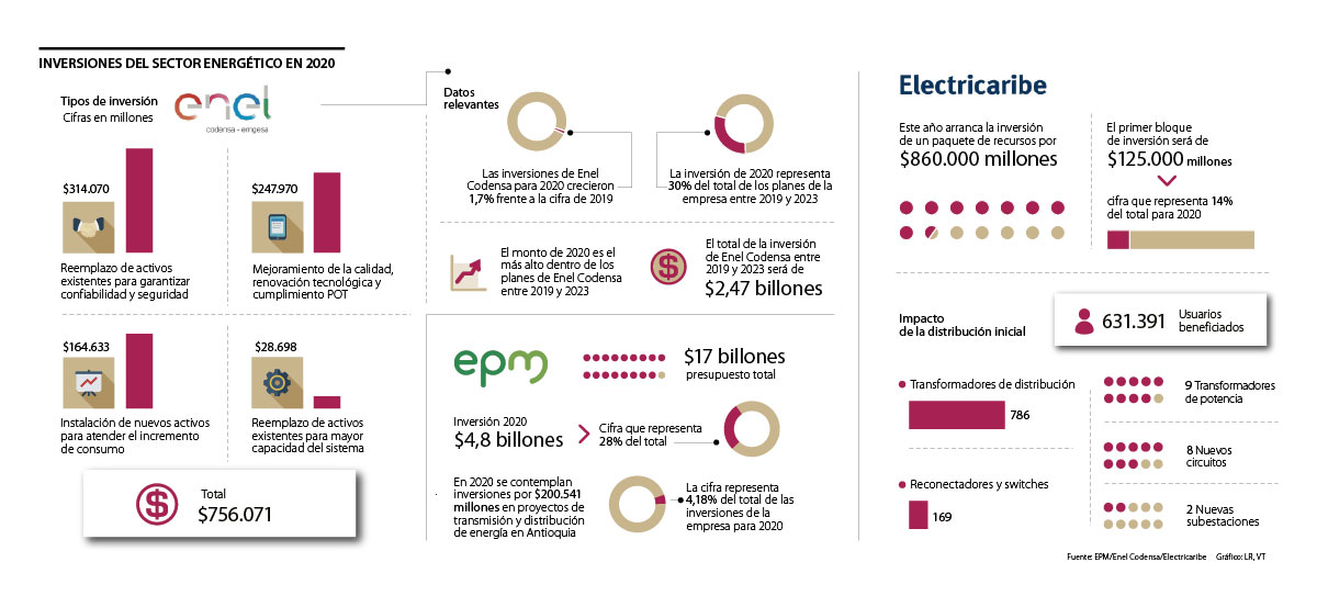 En el caso de Enel Codensa, 2020 representa el año más importante de su estrategia de inversión 2019-2023, pues la empresa destinará $756.071 millones que se dividen en cuatro tipos de inversión centrados en el reemplazo de activos existentes para garantizar seguridad e incrementar la capacidad del sistema, instalar nuevos activos para atender el incremento de consumo y la renovación tecnológica.